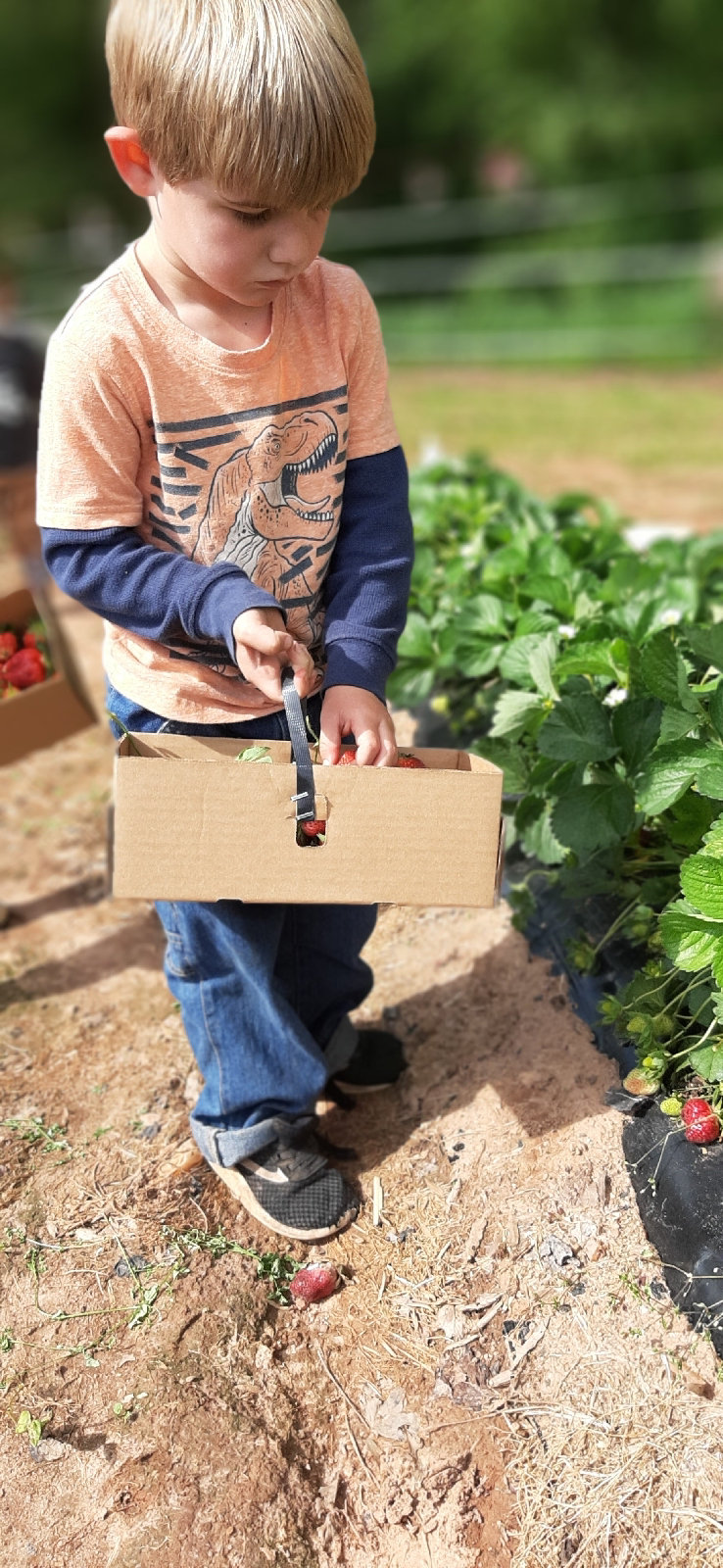 fresh strawberries. Tobias wore his rain boots (as he does every day regardless